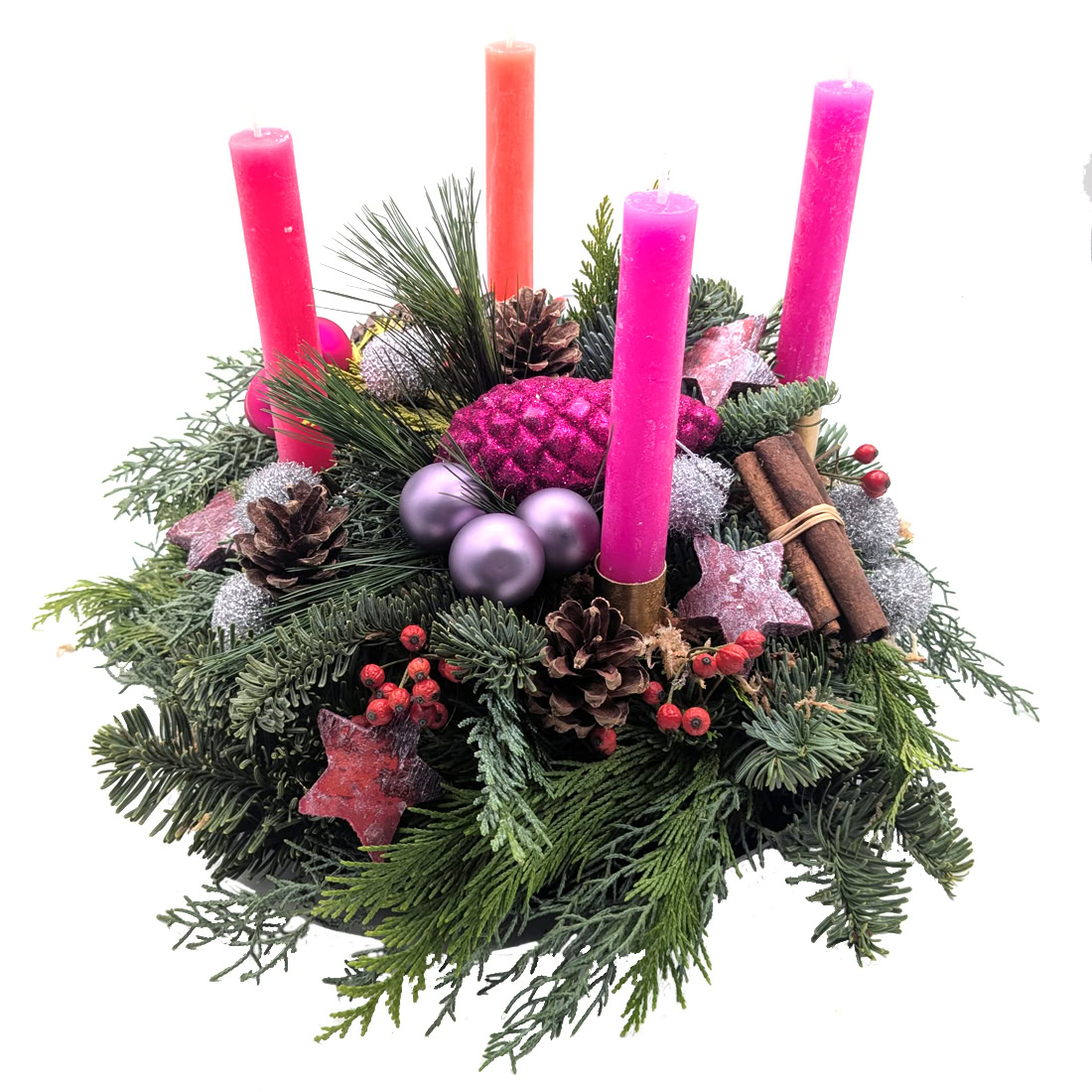 Add some color Christmas arrangement with candles, fuchsia pink and orange. The trendy colors of this Christmas. Delivered with 4 candles