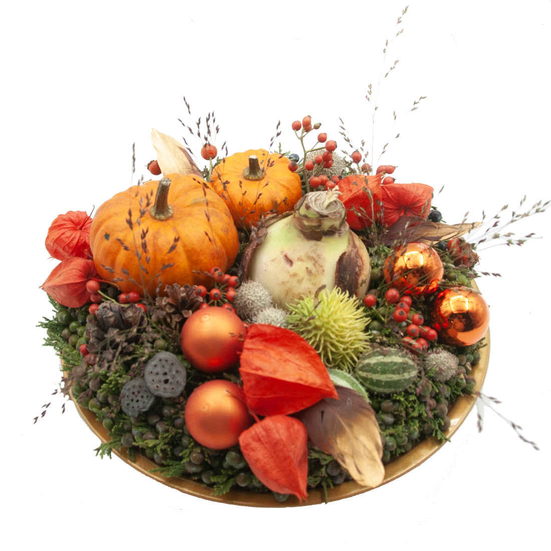 Bring the warmth of autumn into your home with this beautiful Autumn wreath on plate (approx. 30 cm). A stylish arrangement featuring small pumpkins, physalis, berries, ornamental apples, and decorative autumn materials in warm shades of orange and green.