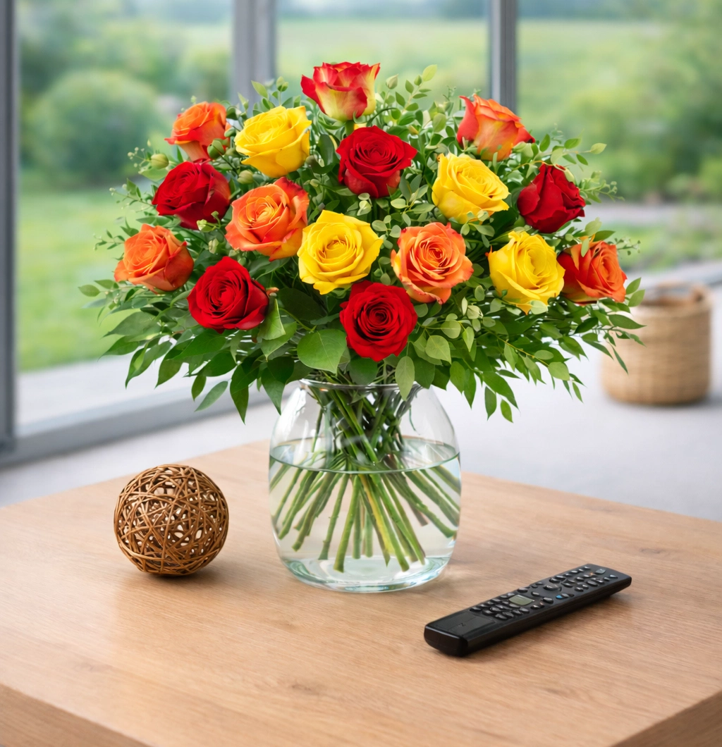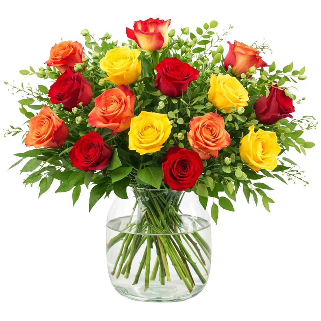 Bouquet of red yellow and orange roses, this bestseller is hand tied by a local professional florist.
