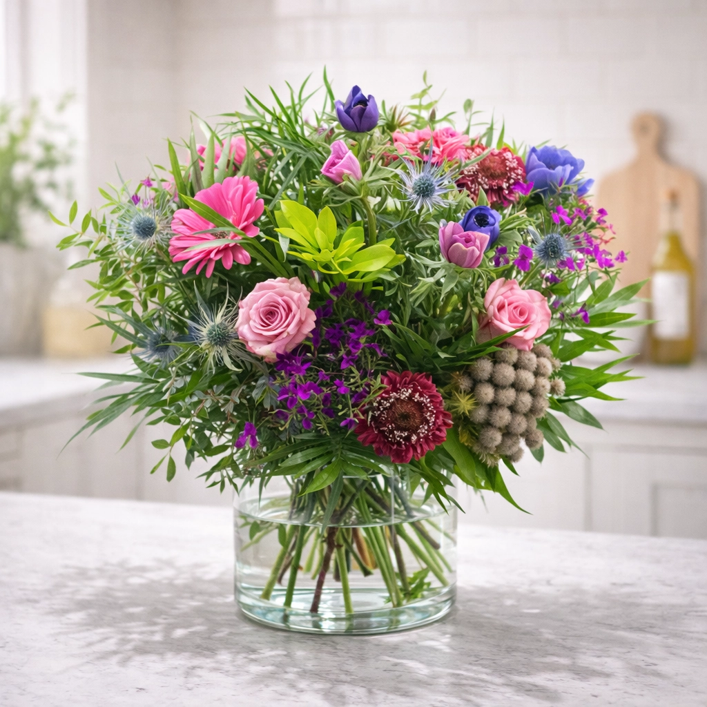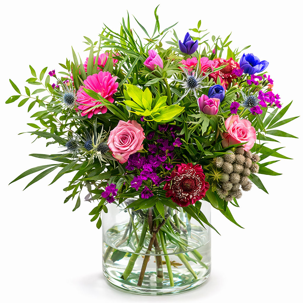 A bouquet of soft spring colours, beautifully coordinated with each other. Various lilac, purple and blue spring flowers tied into a beautiful round bouquet. Suitable for many occasions such as a birthday, thank you or as a pat on the back.