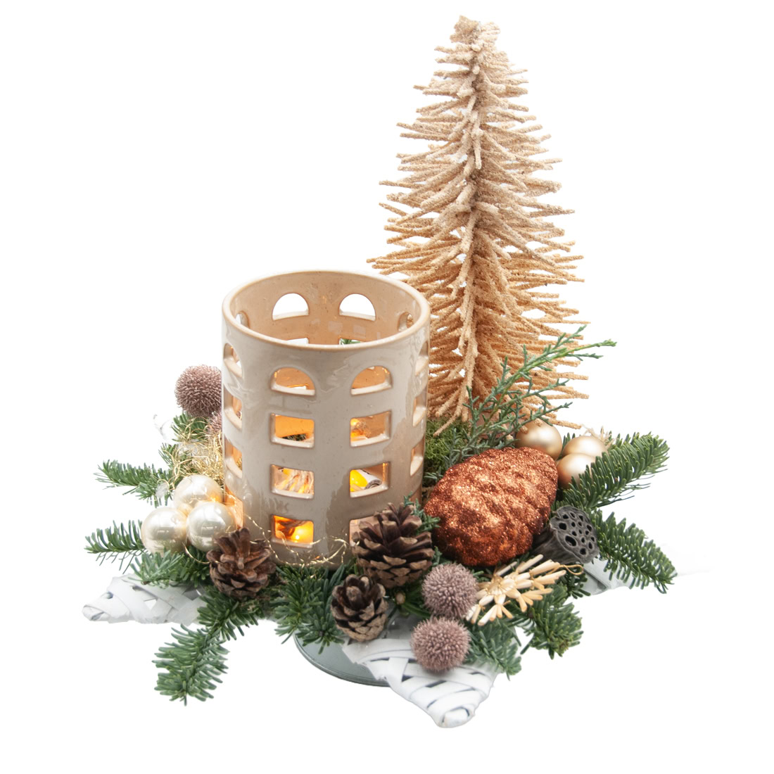 Bring a touch of luxury and warmth into your home with the Nature Gold Christmas arrangement. This elegant table piece combines natural elements like evergreens, wood accents, and pine cones with golden ornaments and a soft winter tree for a chic, festive look.