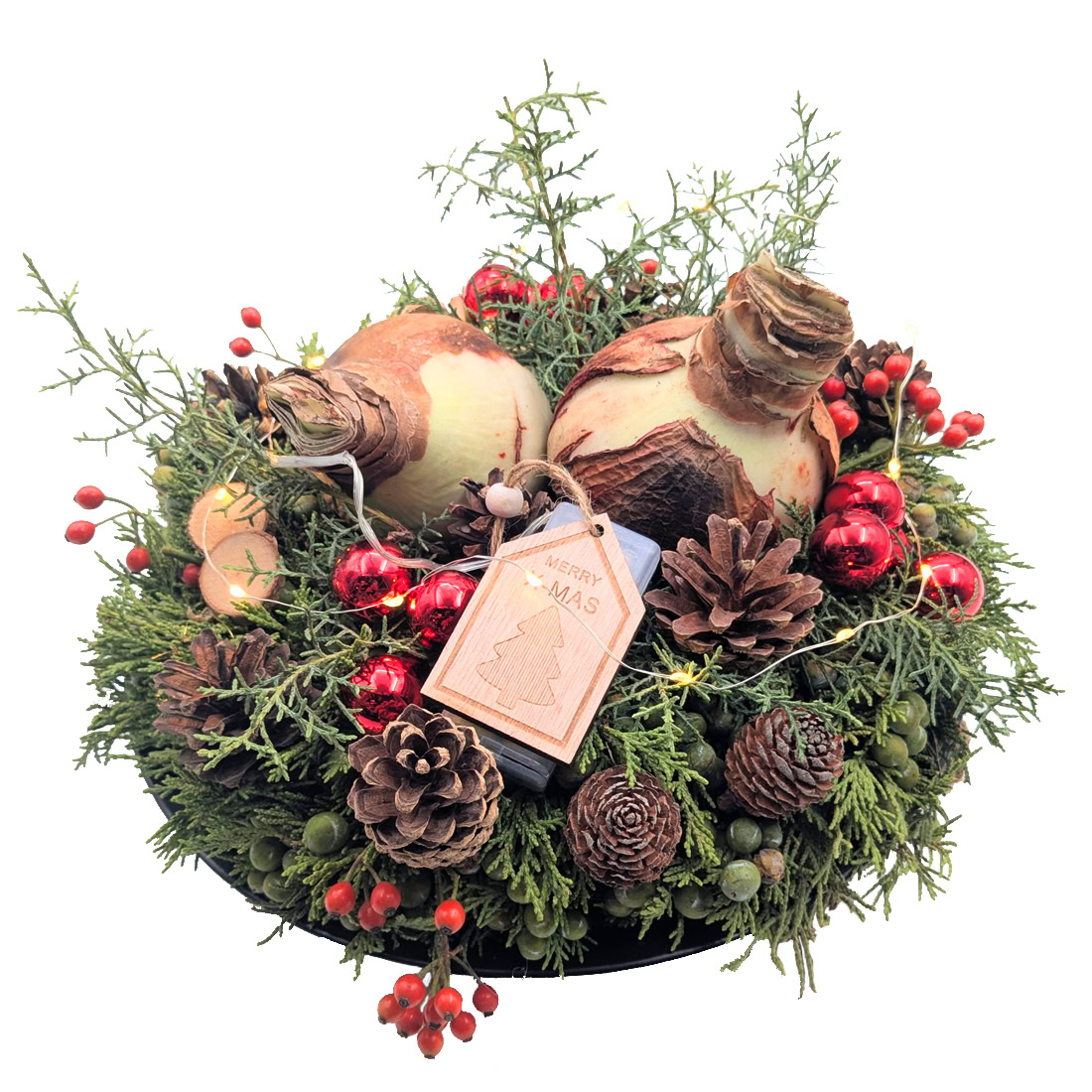 Christmas arrangement with Amaryllis made on a 30 cm dish in warm red Christmas tones.