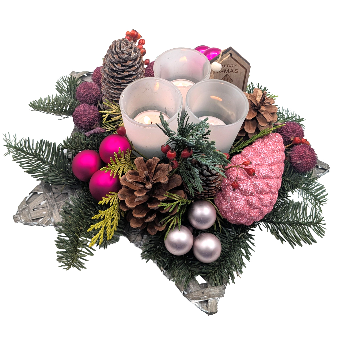 Christmas piece pink. Delight someone (or yourself!) with this elegant Pink Stars Christmas Arrangement. A stylish Christmas piece with natural materials, pinecones, soft pink accents and three cosy lights perfect for the table, a sideboard or as a warm seasonal gift. This Christmas arrangement is made by the local florist and may differ from the photo.