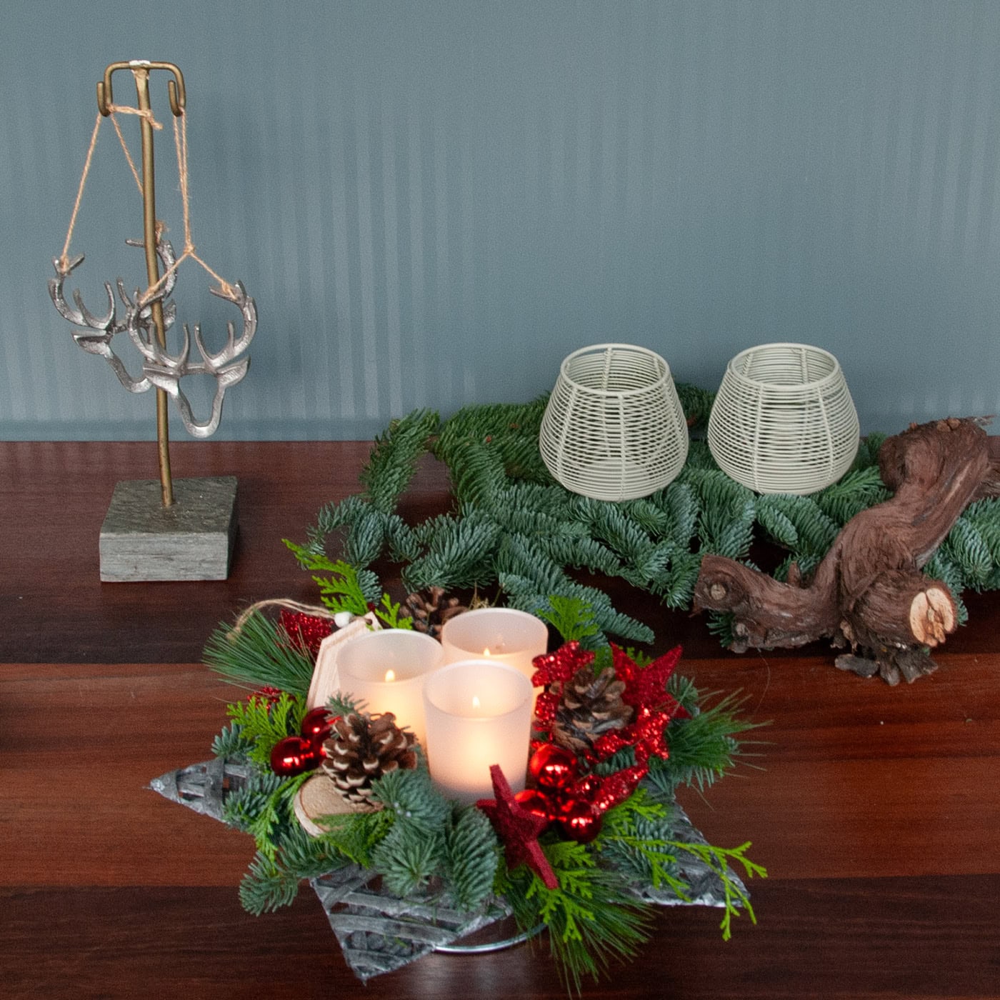 Christmas piece red tones with tea light(s) arranged in a bowl or basket.