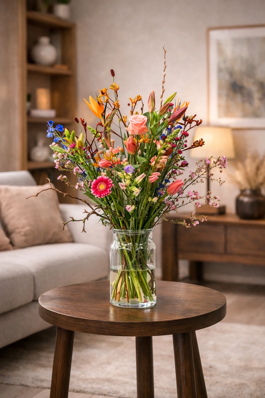 A treat to receive and to give. Bouquet of various colored flowers, tied around into a beautiful bouquet. Suitable for many occasions such as a birthday, thank you or as a helping hand.