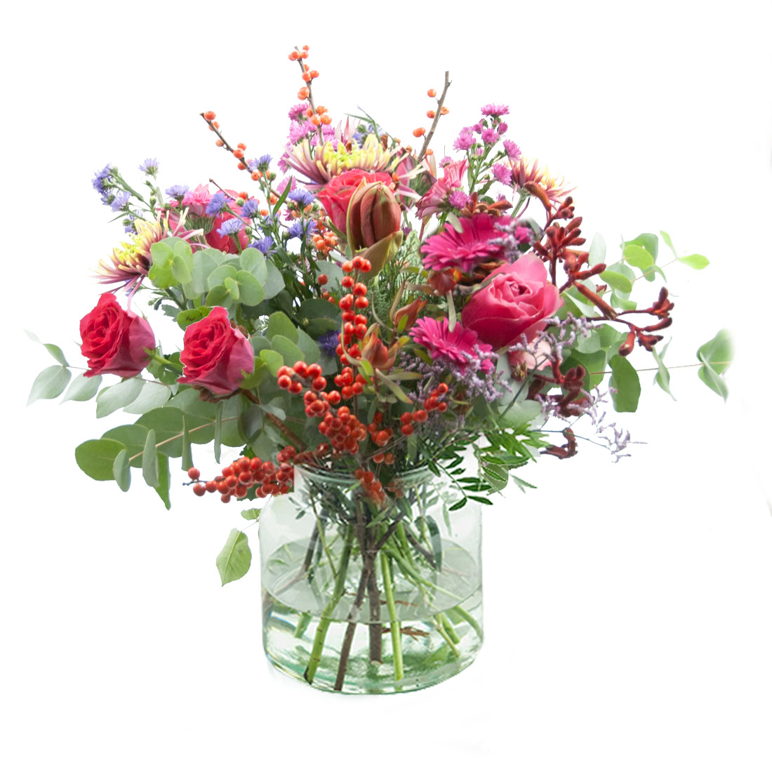 Colorful Winter Celebration. Bring color and warmth into your home with this sparkling Christmas bouquet in richly mixed winter tones. This cheerful arrangement combines fresh flowers and natural pinecones into a festive eye-catcher.