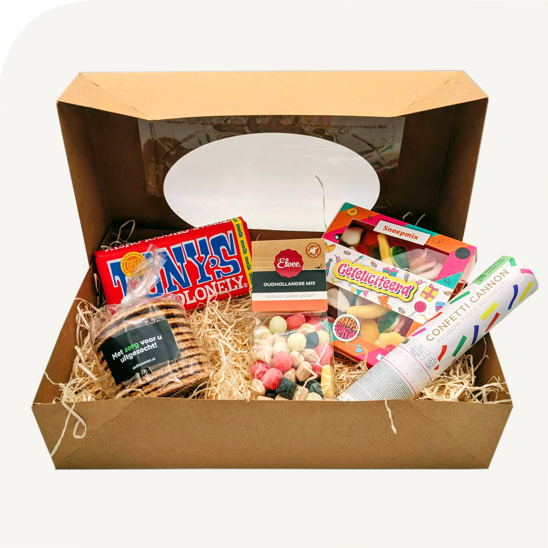 Filled with delicious Dutch treats like Tony’s Chocolonely chocolate, stroopwafels, vintage sweets, candy mix and a confetti cannon for that extra burst of joy. Always a nice gift!