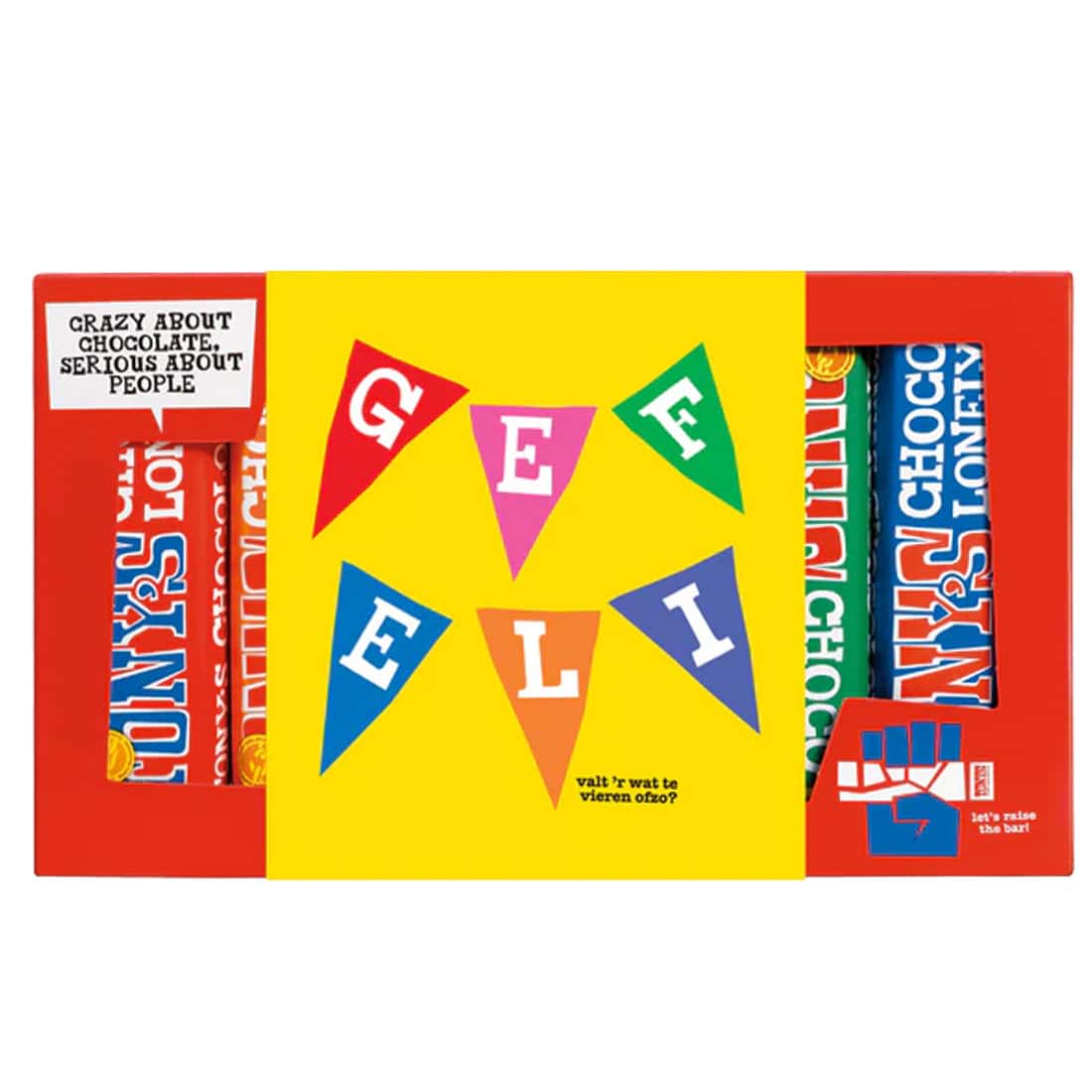 Tony’s Chocolonely tasting congratulations on 6 bars of 47/50 grams in the flavors pure, pure almond sea salt, milk hazelnut, milk nougat, milk caramel sea salt and milk. Always a nice gift!