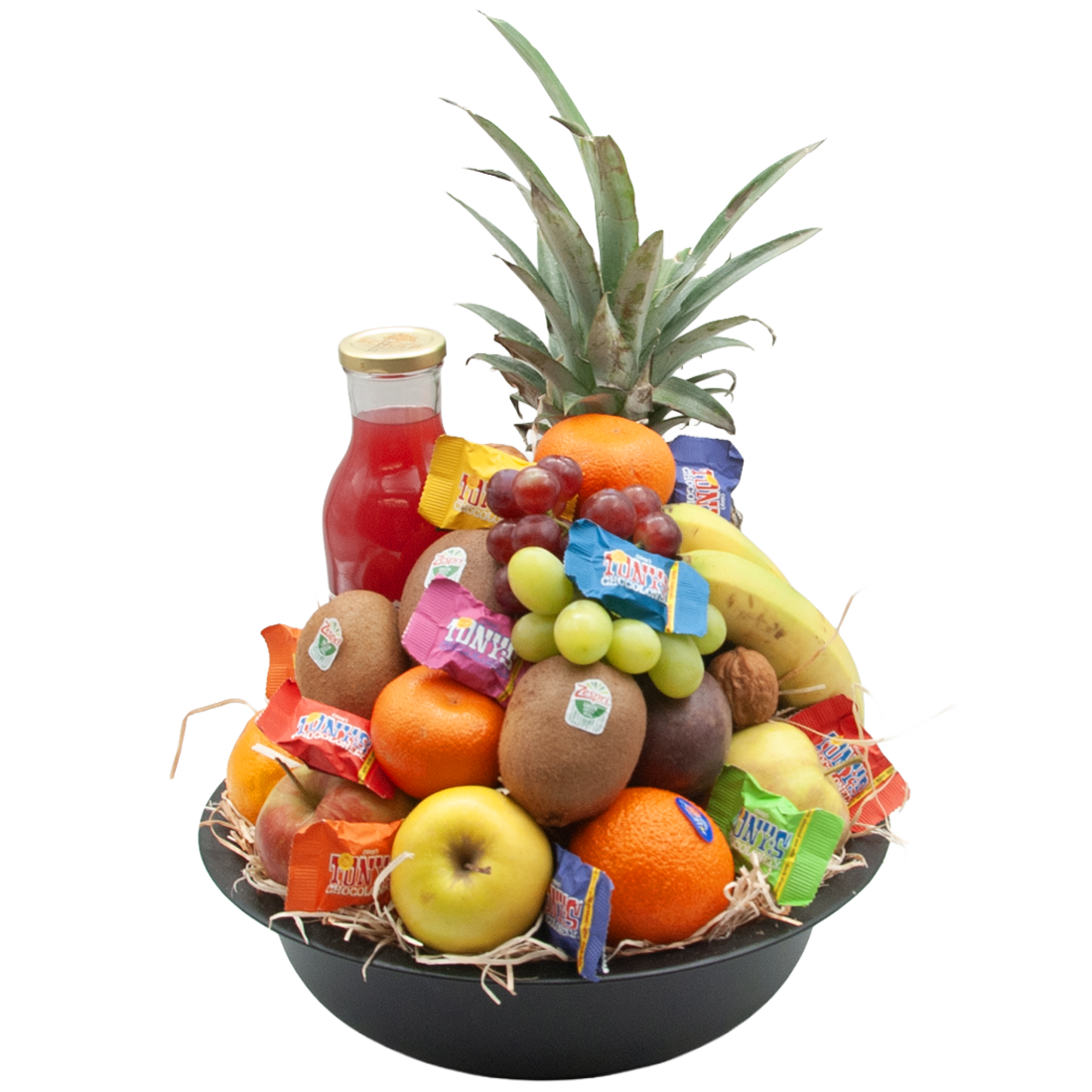 Fruit basket Luxe with Tony Chocolonely and juice Our fruit baskets are put together by our fruit specialist just before we send them to the recipient.