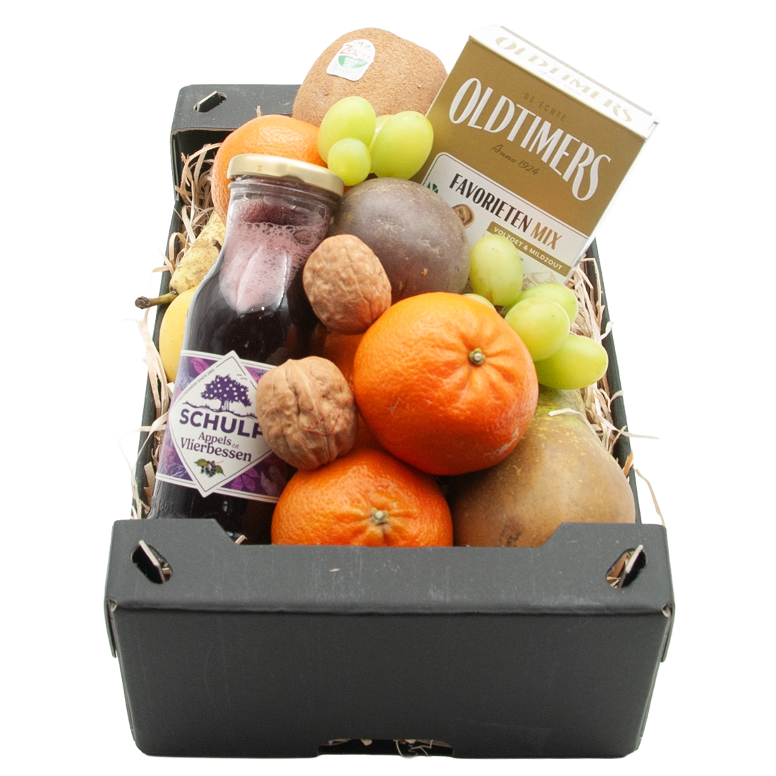 Fruit box old fashioned treat. Includes a 0.2L bottle of Schulp juice and a 235-gram box of Oldtimers mixed licorice. Packed with vitamins. Always delicious fresh fruit carefully selected for you!