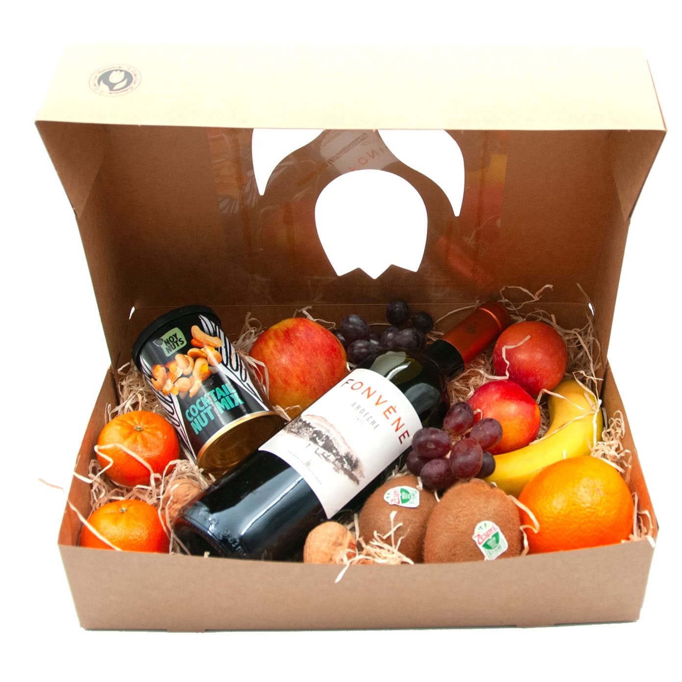 Fruit box red wine and cocktail nut mix. This fruit box contains a bottle of delicious red wine from the Ardèche