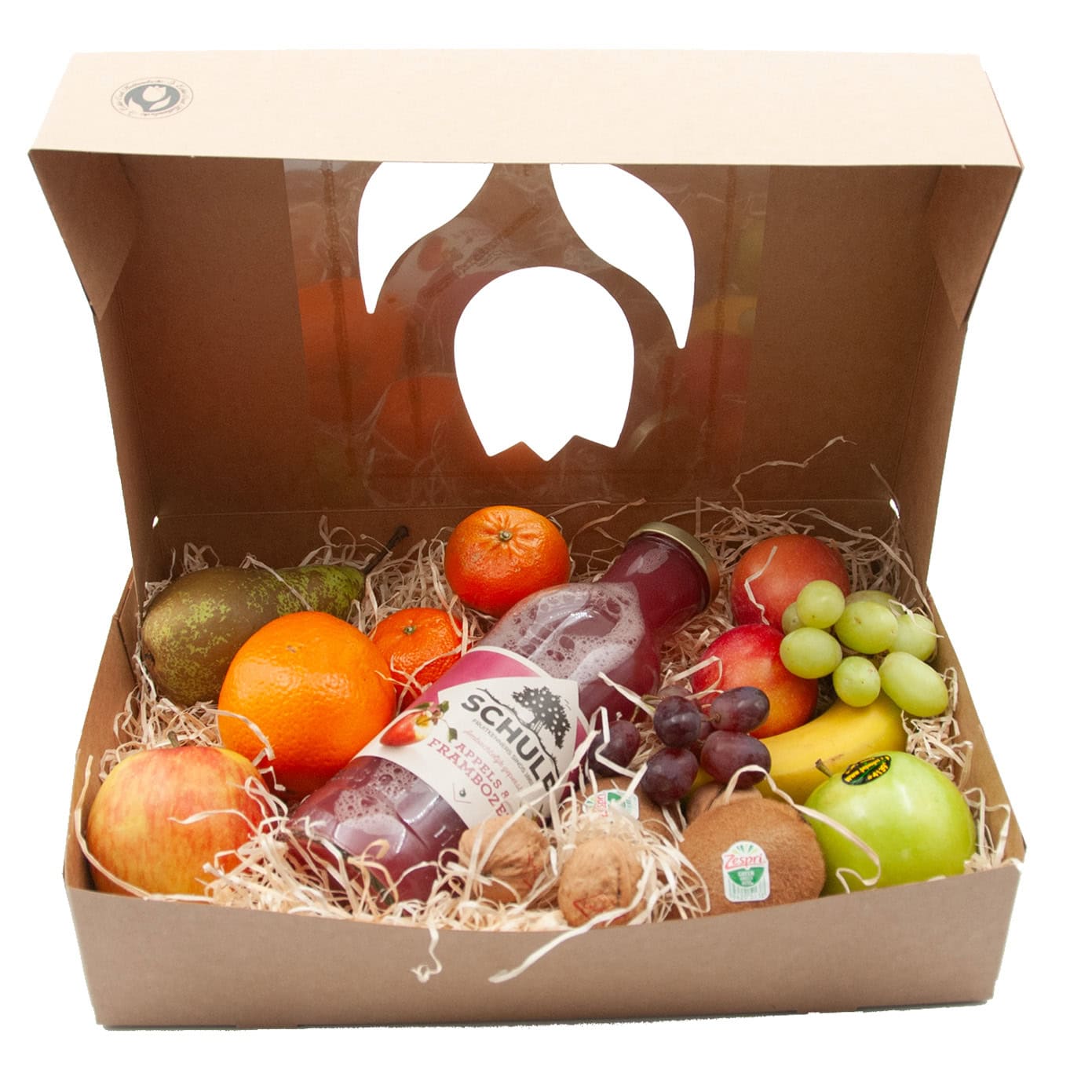 Fruit box with a large bottle of juice, our fruit baskets are put together by our fruit specialist just before we send them to the recipient.