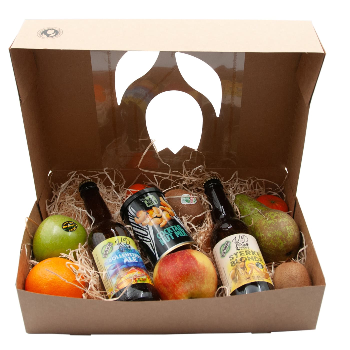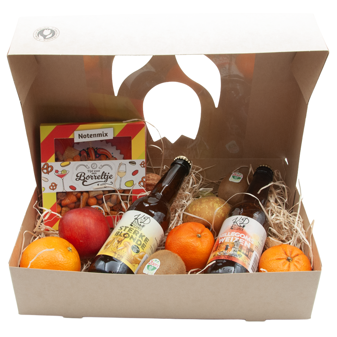 Fruit box with special beer and cocktail nut mix. This fruit box contains two bottles of special beer from the Klein Duimpje brewery