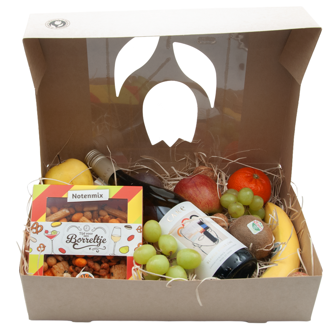 Fruit box with white wine and cocktail nut mix. This fruit box contains a bottle of delicious white wine from Spain. Always delicious fresh fruit carefully selected for you!