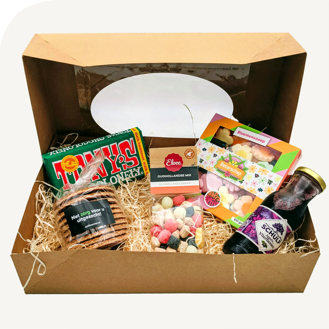 A delicious selection of traditional Dutch treats and sweet surprises, including Tony’s Chocolonely chocolate, stroopwafels, flower-shaped candies, vintage Dutch sweets and a bottle of fruit juice 200ml. Always a nice gift!