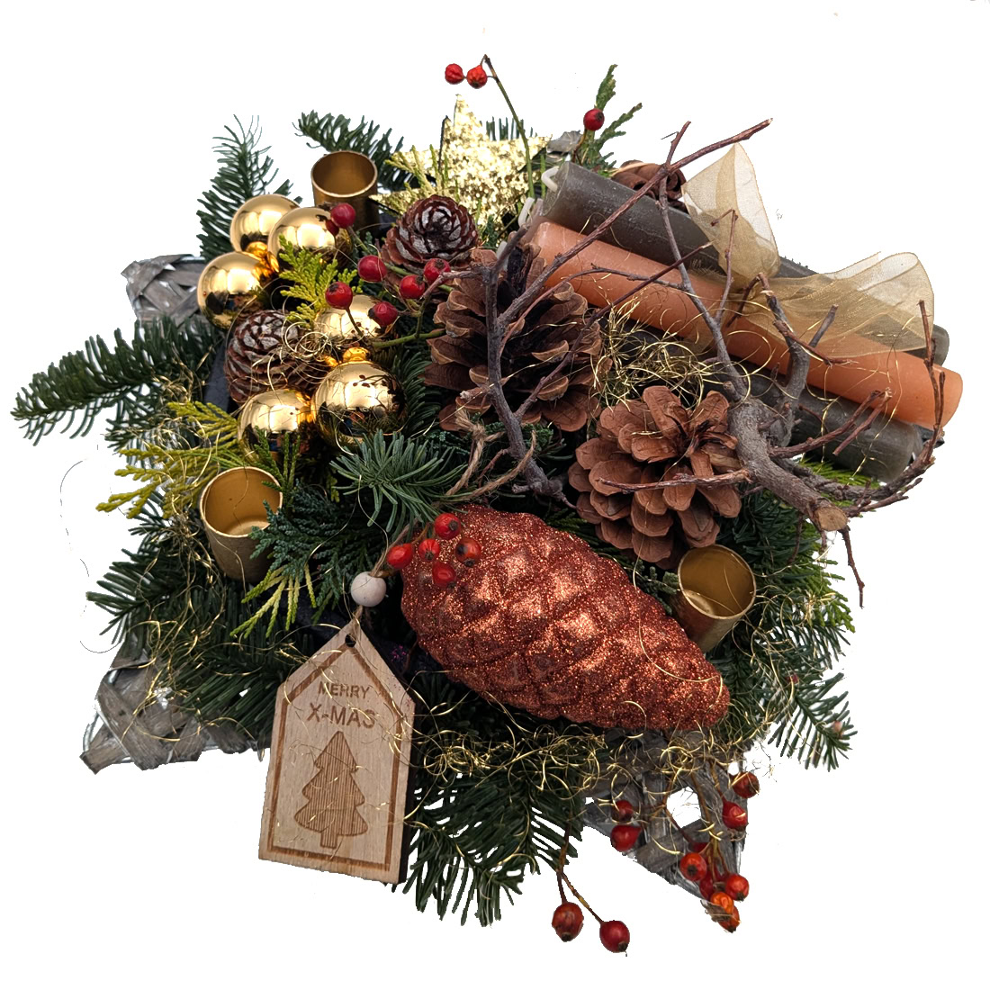 Golden stars star Christmas arrangement, Christmas piece with 4 candles decorated with gold and bronze Christmas decorations.