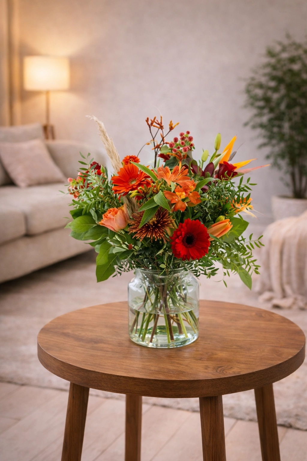 Luxury bouquet orange red. A treat to receive and to give. Bouquet of various flowers in warm shades of red and orange. Suitable for many occasions such as a birthday, thank you or as a helping hand.