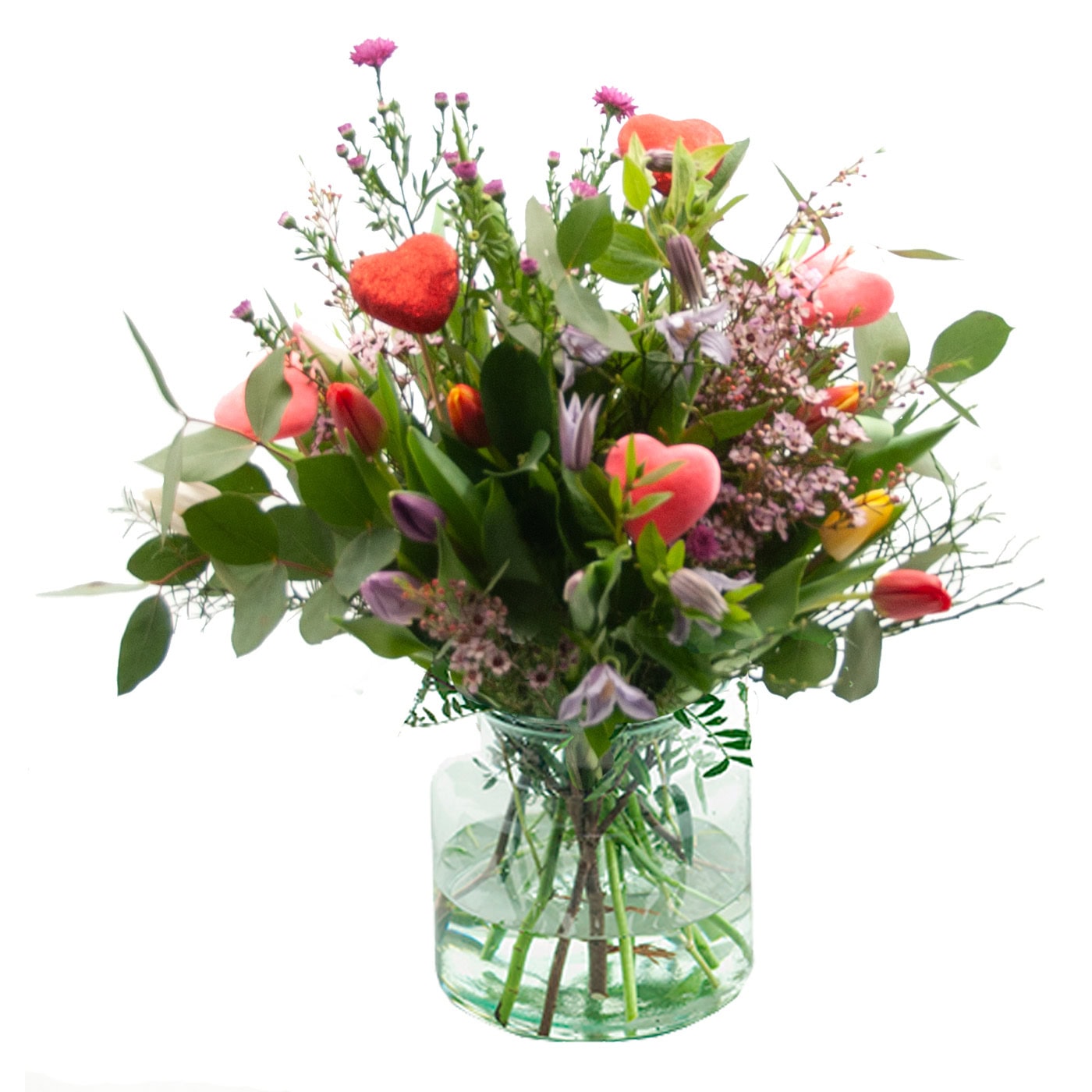Madly in love – bouquet with mixed tulips, greenery and hearts on a stick