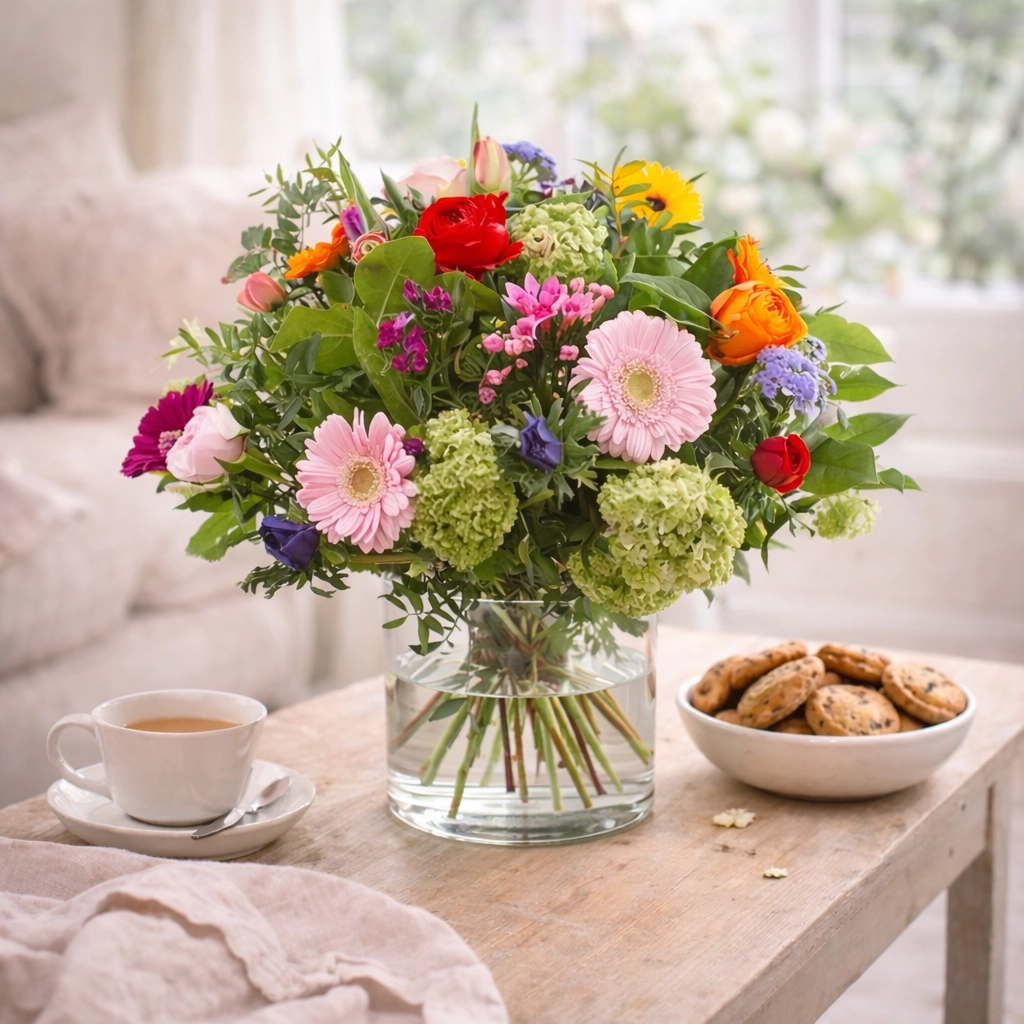 Mixed color spring flowers, this colorful bouquet is hand-tied by a local professional florist.