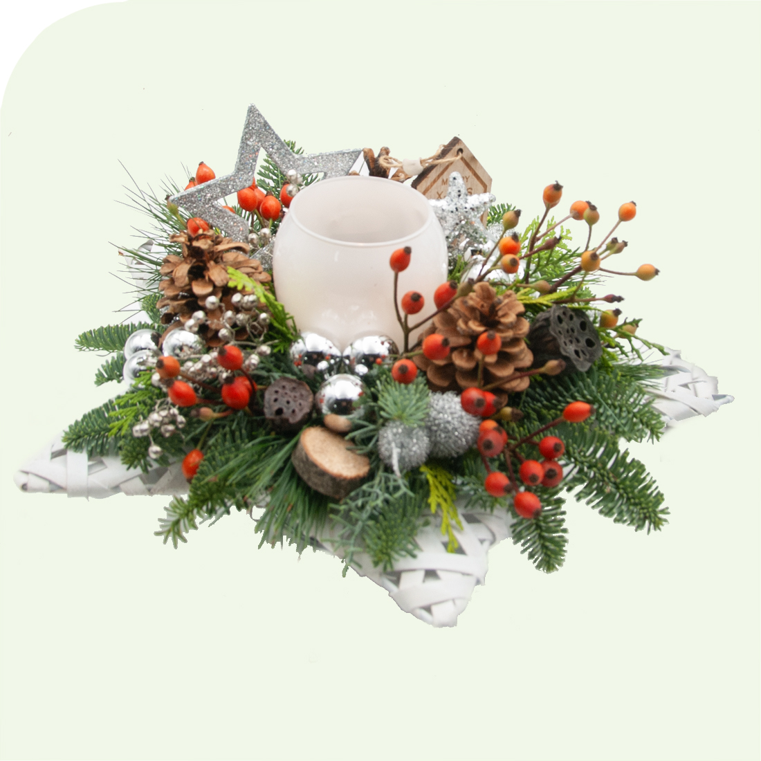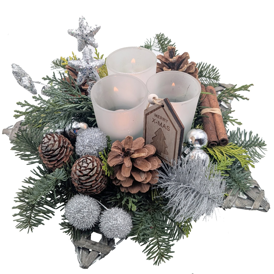 Silver Christmas piece. Bring a chic winter atmosphere into your home with this elegant Silver Stars Christmas Arrangement.A stylish Christmas piece with natural materials, pinecones, silver accents and three cosy lights perfect for the table, a sideboard or as a luxurious seasonal gift. This Christmas arrangement is made by the local florist and may differ from the photo.