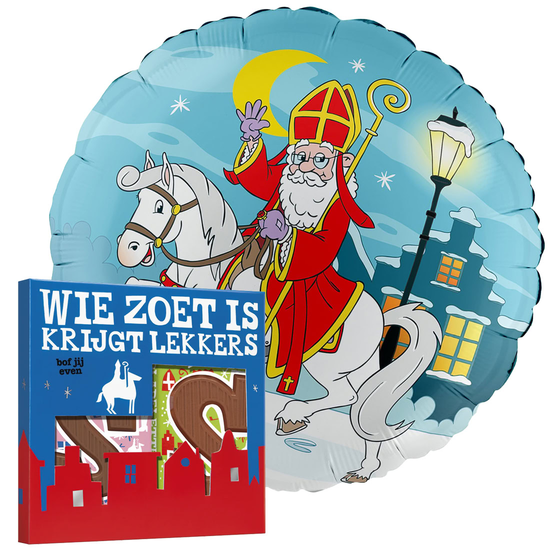 Sinterklaas Party in a Box. Surprise young or old with this cheerful gift set featuring a Sinterklaas helium balloon and two chocolate letters in festive packaging milk chocolate with spiced cookie & marshmallow pieces (S) and milk chocolate with almond paste & speculaas flavor (S) both from the “Who’s been good, gets a treat!”A balloon from a box, always a nice floating surprise!