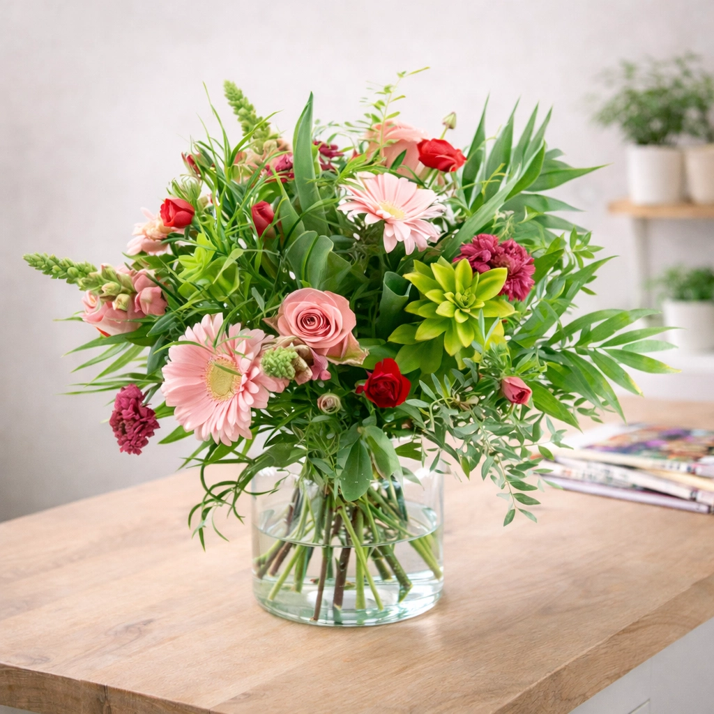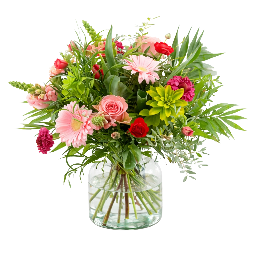 Our florists create a fantastic bouquet with the most beautiful pink and red spring flowers. Order a matching glass vase to make it a complete gift.