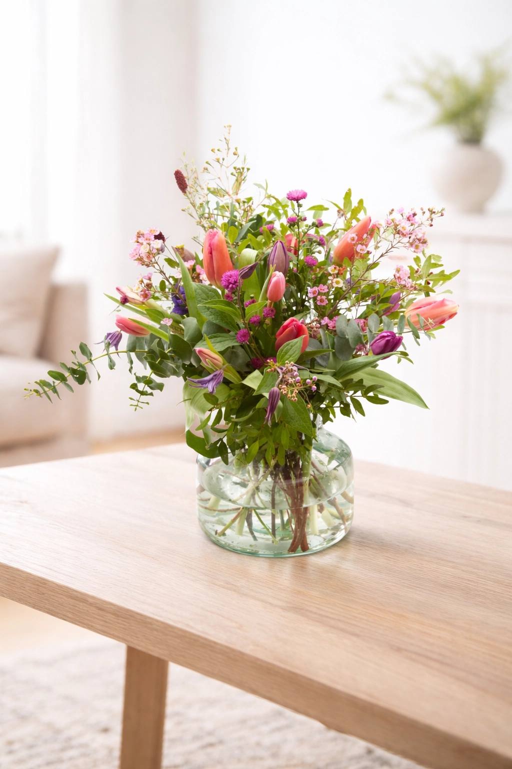 Crisp fresh tulips in pastel colors with spring flowers. A treat to receive and to give. Suitable for many occasions such as a birthday, thank you or as a helping hand.