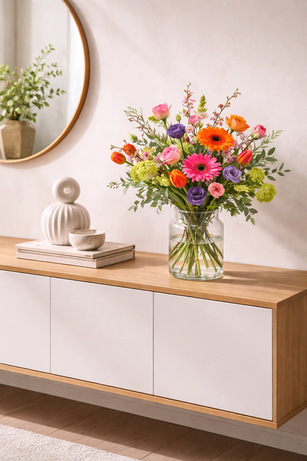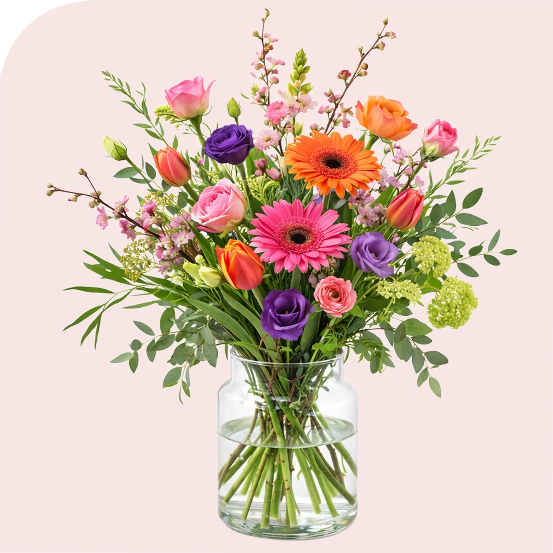 The combination of pink and orange gerberas, tulips, lisianthus and elegant blossom branches creates a bouquet that immediately stands out and brings a cheerful spring atmosphere into any home.