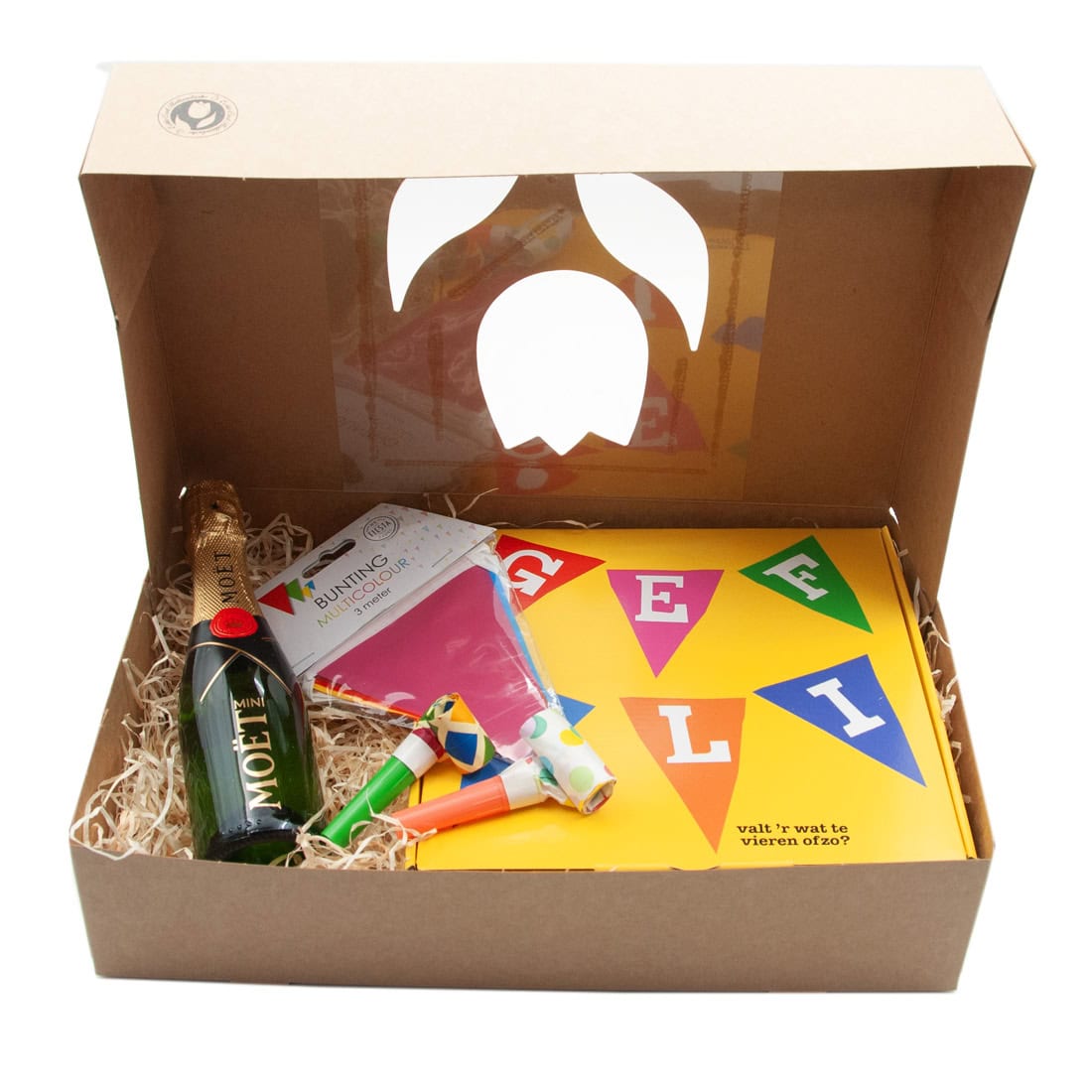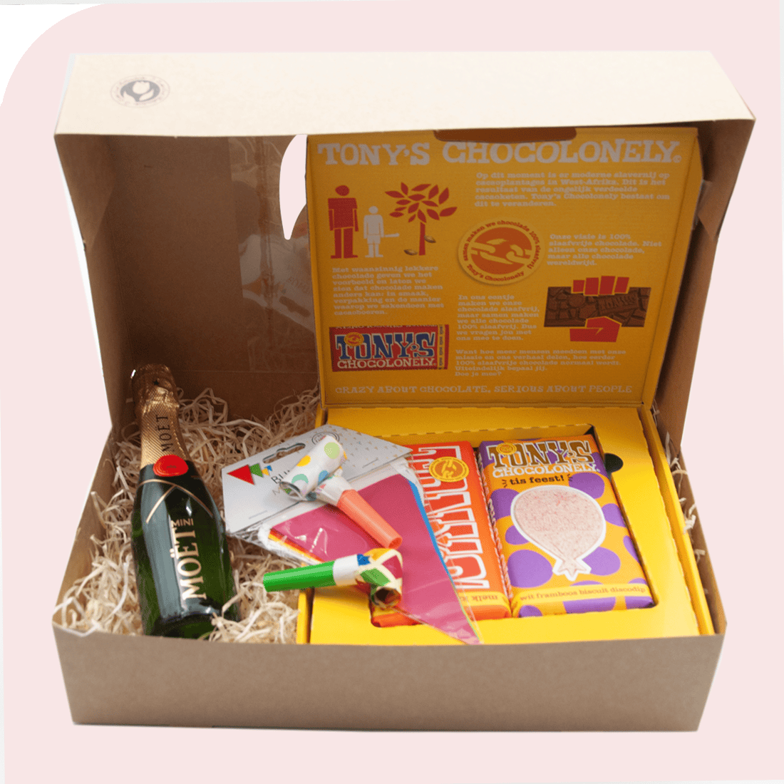 Tonys and Bubbels Gift Box. Party? This sparkling gift box instantly says: congratulations! Whether it’s a birthday, anniversary, promotion, or any other occasion worth celebrating, this cheerful box is always a winner. Enjoy the rich flavors of Tony’s Chocolonely in festive flavors, accompanied by a mini Moët & Chandon champagne bottle. Includes party favors like party whistles and flags – ready to surprise someone!