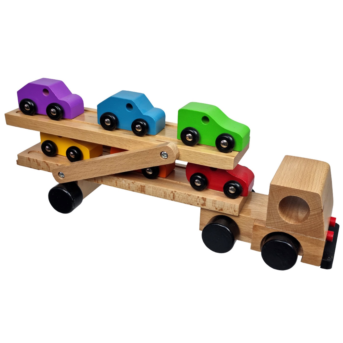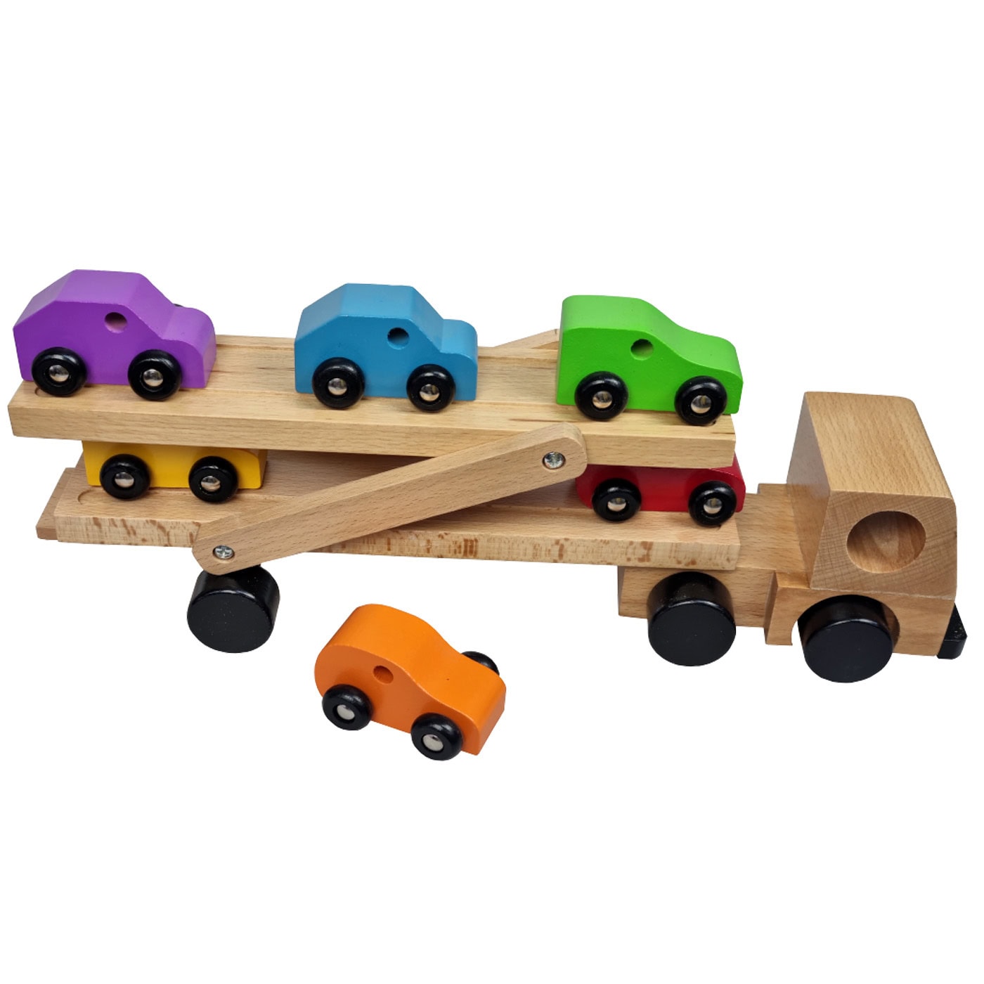 Wooden toy car transporter, truck with 6 colored cars. The cars of the car transporter are made in different colors, which provides an extra cheerful and playful look. The upper deck of the transporter is movable, so that the cars can easily drive on and off.